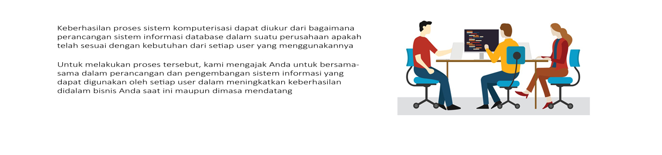Dengan pengalaman yang kami miliki, kami hadir dan siap membantu sebagai Mitra Kerja untuk mengembangkan serta menyelesaikan permasalahan yang dihadapi pada perusahaan dalam mewujudkan sistem informasi yang terintegrasi. Yang pada akhirnya dapat digunakan oleh perusahaan dalam meningkatkan bisnis saat ini maupun dimasa mendatang.